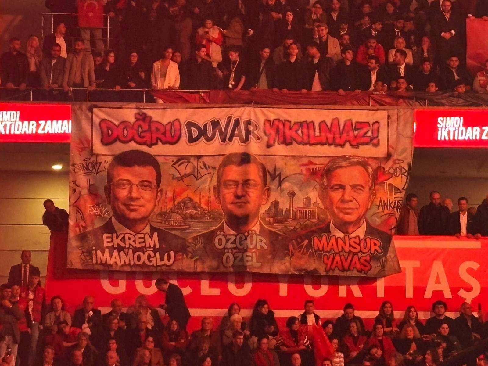 Kurultayda Özgür Özel, Ekrem İmamoğlu ve Mansur Yavaş’ın resimlerinin olduğu “Doğru duvar yıkılmaz” pankartı asıldı