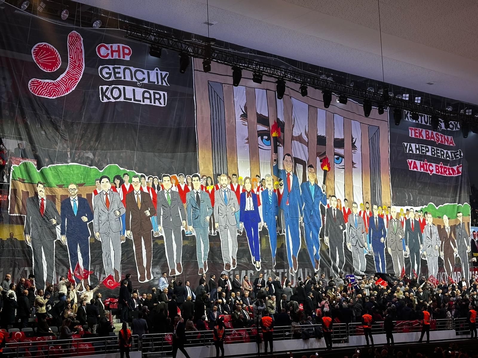 Kurultaya özel devasa boyutlarda birçok pankart hazırlandı. Üzerinde “Doğru Duvar Yıkılmaz” yazan graffiti pankartta İmamoğlu ve Yavaş, Özel’in iki yanında resmedilirken CHP Gençlik Kolları’nın hazırladığı, İmamoğlu ve Özel’in meşalelerle vatandaşları arkasına alarak Anıtkabir’den yürüdüğü pankart da tribünlerin üzerinde açıldı.
