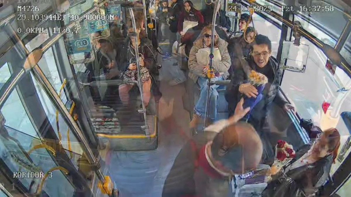 Seyir halindeyken trafik ışıklarındaki çiçek satıcısından iki buket çiçek alan Ayaztekin, otobüste yolculuk yapan öğretmenlere hediye ederek 24 Kasım Öğretmenler Günü’nü kutladı.