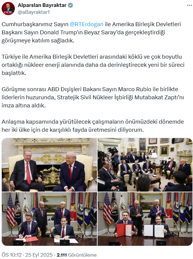 Görüşme sonrası ABD Dışişleri Bakanı Sayın Marco Rubio ile birlikte liderlerin huzurunda, Stratejik Sivil Nükleer İşbirliği Mutabakat Zaptı’nı imza altına aldık.