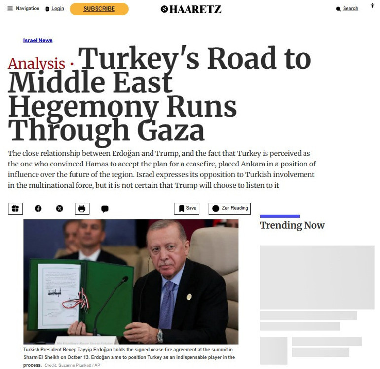 Haaretz, Ankara’yı “bölgenin geleceğini şekillendiren başlıca aktör” olarak tanımladı.