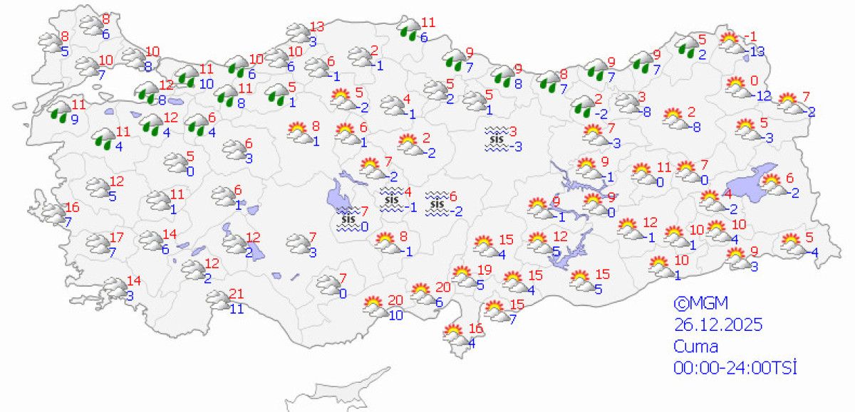 Ülke genelinde parçalı bulutlu, iç bölgelerde hafif kar ihtimali öngörülüyor.