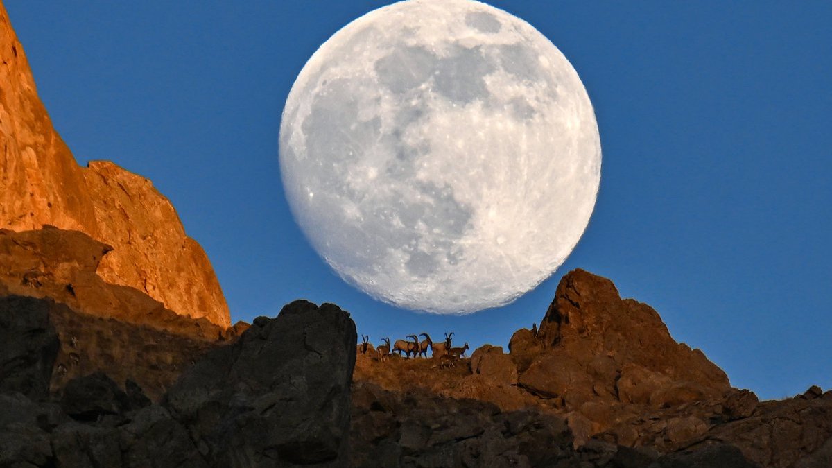Dağların en tepesinde toplanan yaban keçileri, tam da süper dolunayın ışığı altında silüetlerini oluşturdu.