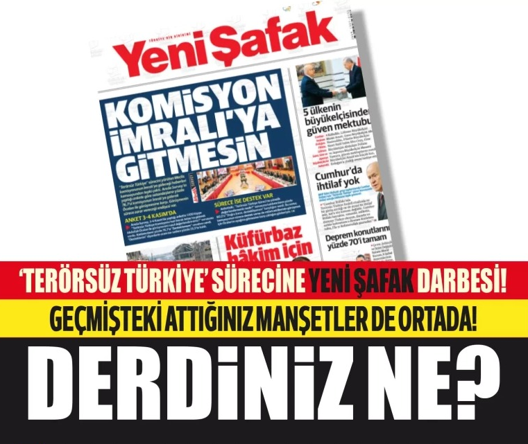 İktidara en yakın gazetelerden birisi olan Yeni Şafak, zaman zaman iktidar aleyhine attığı manşetler ile gündemde. Bir numaralı hedefine Şimşek’i koyan Yeni Şafak son olarak süreç kapsamında vekillerin İmralı’ya giderek Öcalan ile görüşme tartışmalarında ‘Komisyon İmralı’ya gitmesin’ manşeti ile gündem olmuştu.
